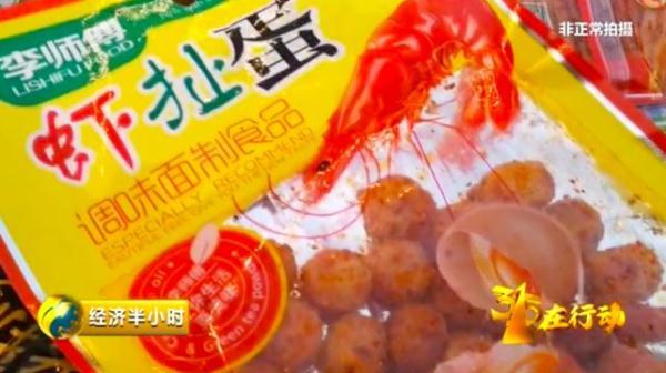 工作人员承认,虽然包装上醒目地印着虾和蛋,但实际上“虾蛋”辣条里既没有虾也没有蛋,除了面粉,是多种调味添加剂。