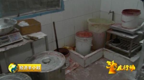 生产线上的膨化面团球溅得到处都是,生产车间的地面上,满地的灰尘与机器渗出的油渍交织在一起。搅拌桶也满是油渍,离搅拌机几米远就是水池。游泳池的池壁上布满了黑色的污渍。水池里的白桶、水桶上沾满了厚厚的污垢。一滴水正从水龙头生锈的接头渗出,落入下面的水桶。