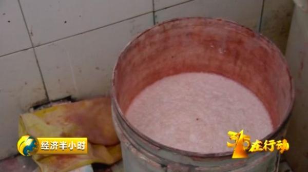 在李俊食品的其他车间,装有各种添加剂的桶很脏,表面发黑。添加剂桶直接和脏手套放在满是污渍的角落里。