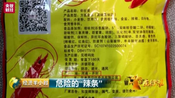 不合格辣条在今年3·15晚会上被曝光。这款名为“虾蛋”的辣条生产地址为河南开封,生产厂家为兰考县宁远食品有限公司,包装袋上的食品生产许可证编号清晰可见。