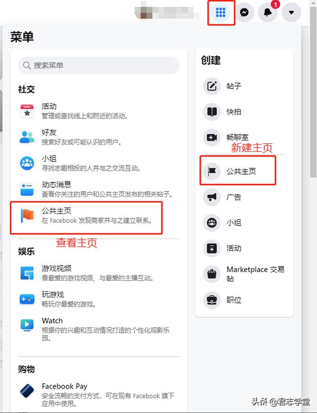 输入脸书个人号码,点击右上角菜单按钮,在创建列表中选择“公共主页”。
