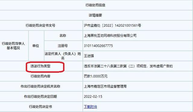 中国经济网北京,2001年2月25日。上海市市场监督管理局网站近日发布的行政处罚决定书(沪监罚初字[2022]第142021001561号)显示,上海黑桃互动网络科技有限公司发布虚假广告,上海市嘉定区市场监督管理局对其处以罚款1万元。