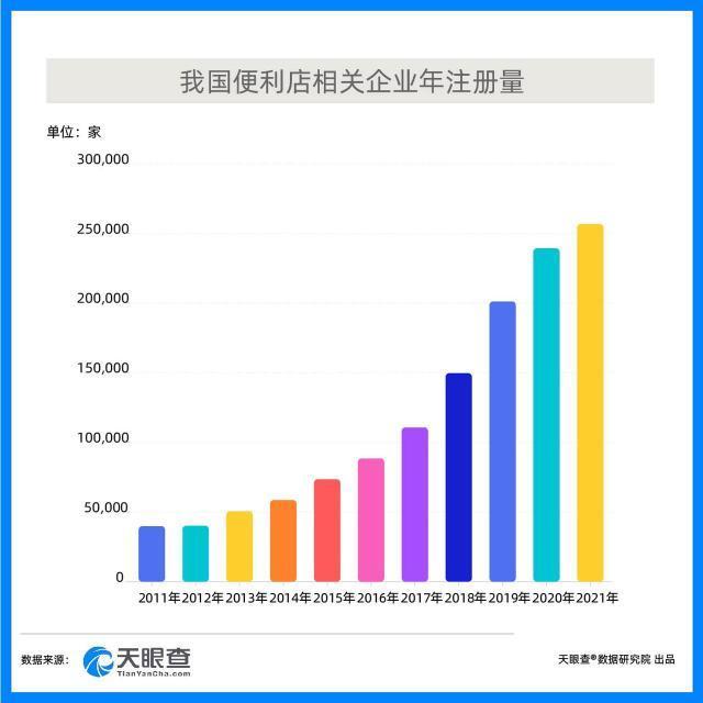 2021年,中国新增便利店相关企业超过25.7万家,较去年增长7.3%。这一年,全国品牌连锁便利店总数将达到30万家,全国中等及以上城市每百万人口不少于200家,24小时营业的连锁便利店比例不低于30%(含无人零售店)。
