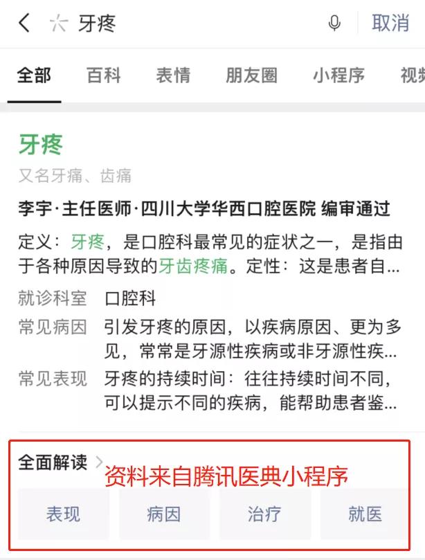 结果是,如果搜索牙痛等特定症状,会先显示来自腾讯医码小程序的信息,一般比较靠谱。
