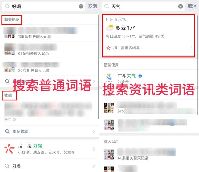 “好吃”等常用词,搜索结果是先显示聊天记录。搜索涉及信息的“天气”,会优先显示可靠性较高的信息,可靠性最大。
