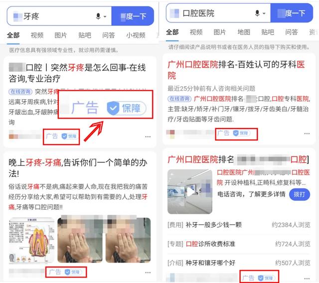 用隔壁的搜索引擎再试试关键词“牙痛”“口腔医院”,广告logo还在最上面。