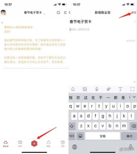 我们只需要打开手机便签,然后点击主页面下方的“+”按钮进行添加,然后编辑贺卡的文字内容,调整格式,保存即可。