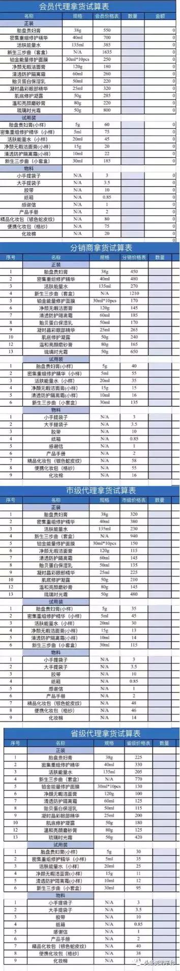 当我们对比代理表和零售表的时候,不难看出,除了试衣和材料之外,正规产品的各级代理商之间的差距特别大,有些产品的代理价实际上只是零售价的零头,暴利肉眼可见。