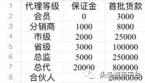 只要3000元就可以成为公司的会员,而且不需要押金。对于上述分配,需要相应的押金。当第一批付款达到相应的门槛,就成为相应级别的代理商,其中合伙人要求每年拿2000万金额的货。以下是成为代理后的商品价格表: