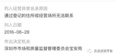 天眼调查显示,深圳法博生物科技有限公司去年因通过户口或经营场所联系不上,被列入经营异常名录,至今未迁出。