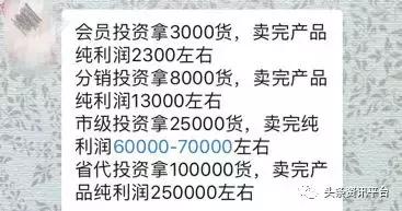 据了解,公司的代理一般分为会员、经销商、市级、省级、总监五个级别。其中一般的代和创始人需要通过公司严格的绩效考核,没钱也能做。目前成为这两级的人屈指可数,但刚加入还不能做这两级的代理。