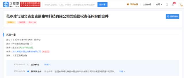 一份裁判文书显示,2019年,因麦在其赞助并认证的微信微信官方账号“玛格琳护肤”中,未经许可,使用范冰冰的照片作为护肤品广告的商业宣传图片,范冰冰向北京市人民法院提起诉讼。
