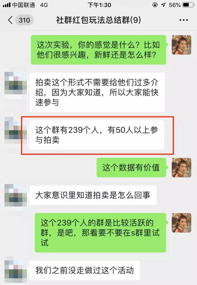我和朋友的社区做了一个拍卖实验,实验很成功。本来不活跃的微信群有239个,实际参与竞拍的有50多人,相当于20%的人被激活了。这个数据相当漂亮。