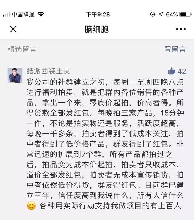 这是什么意思?意思是只要有人在群里得到低的东西,就有人在群里发红包,红包不断,场面非常壮观。所以,无论是拍实体产品还是服务,群内活跃度都是超高的。每天晚上,每组都有超过1000条消息。