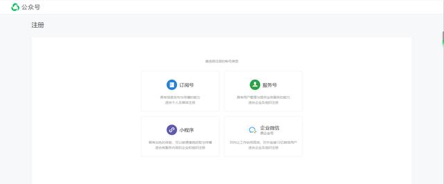 订阅号、服务号、小程序、企业微信号都会显示在这里。我们在注册微信微信官方账号的时候,只要选择订阅号和服务号,点击你想注册的类型就可以了。