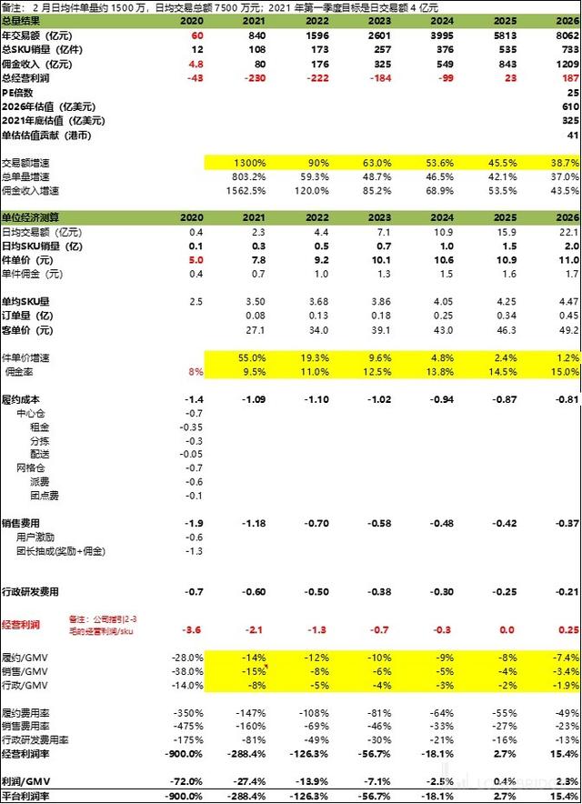四、社区团购能给美团带来的估值弹性有多大?【/s2/】海豚君对美团份额做了一个简单的量化估算:到2026年,美团社区团购年交易额8000亿,对应日均销售额2亿件,每件单价12元,每件利润2.5毛,年营业利润187亿。