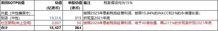 六、整体估值与总结[/s2/]总结一下长桥海豚君对各部分业务估值的计算:美股在合理保守的酒旅+外卖的情况下是315港币,社区团购在单笔盈利的情况下是50港币左右,所以综合估值在360港币左右,总估值1.8万亿港币或2400亿美元。