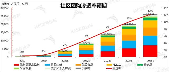 三、社区团购盈利前景到底有多大?对应市场体量,目前海豚君看到的市场大概是1.5万亿到2.5万亿。下图代表了相对乐观的预期。按照目前的监管节奏,海豚君认为应该降低渗透节奏的预期。