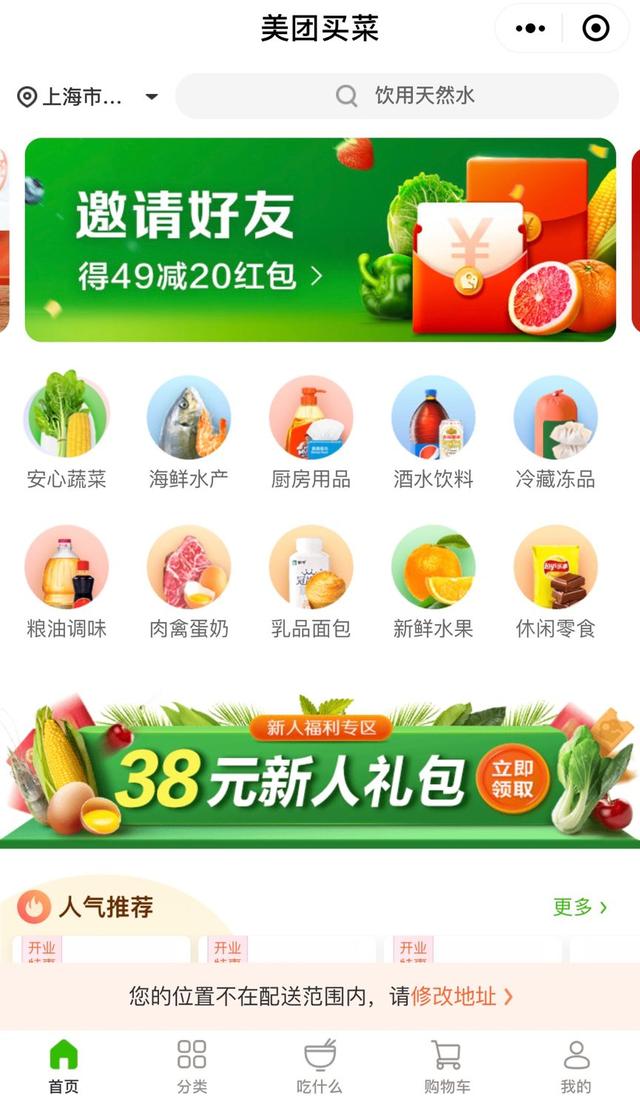 最近美团推出了“美团买菜”,APP和小程序都已经开通。这是负责生鲜零售的小象事业部新推出的检测业务。采用“App+便民服务站”模式,为社区居民送餐。目前仅在上海市虹口区周家嘴路试运营,并在该区域设立了便民服务站,承载仓储、分拣、配送等功能。