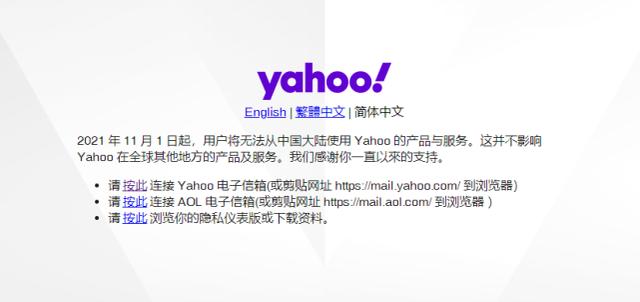 2021年11月,华尔街日报以《雅虎退出中国大陆,中国20年风风雨雨的终结》为题,写下了雅虎退出大陆市场的消息。此后,网民发现雅虎在中国大陆唯一可以访问的在线服务,包括天气应用程序、新闻和信息,以及雅虎旗下的科技媒体Engadget的中文版,都无法访问。