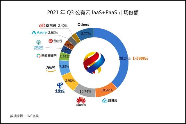 其中,在备受关注的2021年Q3公有云IaaS+PaaS市场份额中,阿里云市场份额为38.24%,排名第一;腾讯云市场份额为10.92%,排名第二;华为云市场份额为10.74%,排名第三。