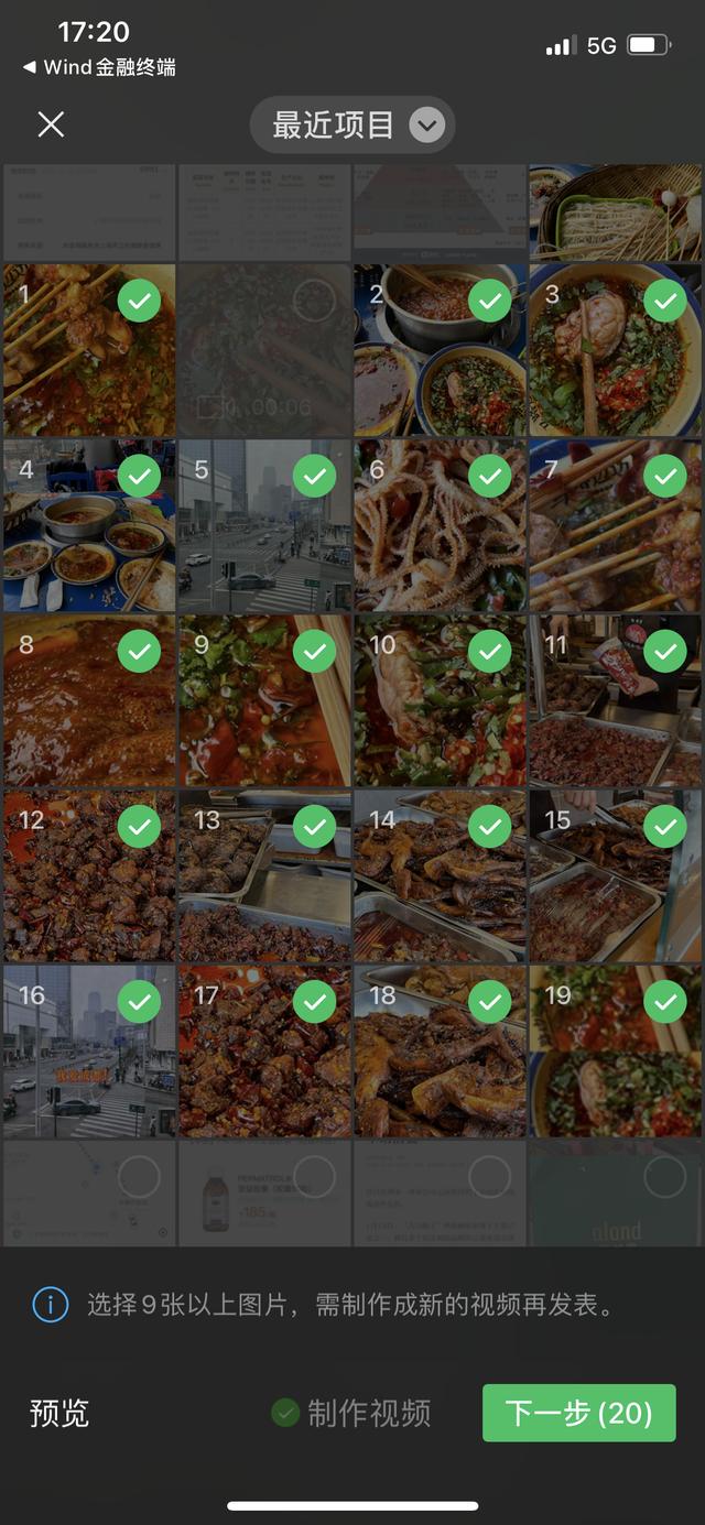 据论文记者测试,在新版微信中,朋友圈已经可以发20张图片了。如果选择的图片数量超过9张,下方会出现提示:“选择9张以上图片,制作新视频后再发布。”点击下一步,选择所需的模板和背景音乐,完成视频制作。