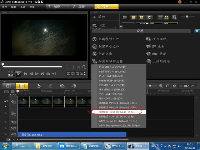 分享用音视频制作的音乐图片时,选择“导出到移动设备”——“手机H.264(320*240,15fps)”。