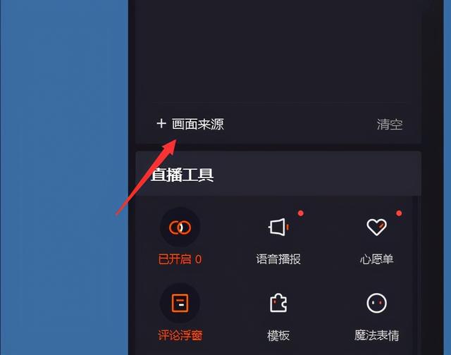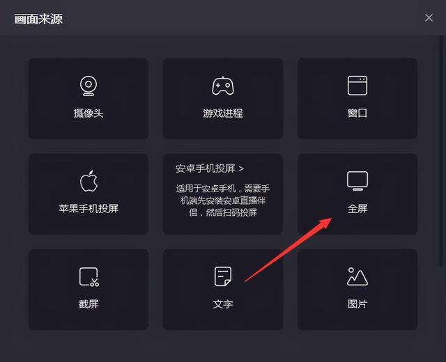 3.开启直播后,点击右边的屏幕源选项,然后选择全屏。