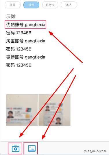 3.输入常用的账号密码,或者启用相机拍摄写在纸上的账号密码,或者在手机上导入带有账号密码的图片。也就是说重要的账号密码,身份证照片等。可以保存在此页面上。反正重要的东西都可以放在这里,支付宝可以帮你保护。