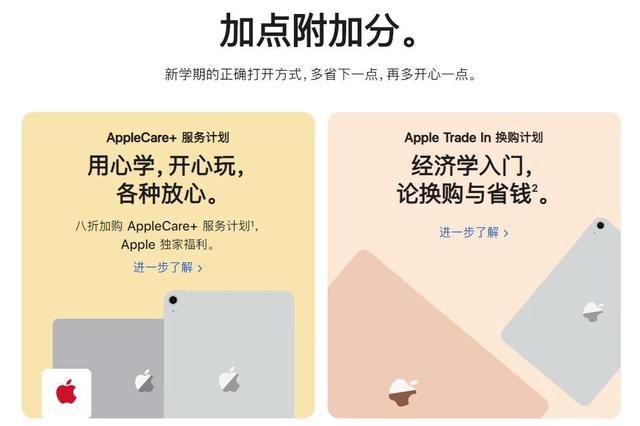 消费者购买教育优惠指定Mac或iPad,可免费获得AirPods耳机一副。如果你愿意,可以通过补差价的方式将赠送的AirPods升级为支持主动降噪的AirPods Pro。活动期间,还可以八折购买AppleCare+服务计划,不仅可以享受更长的保修时间和更低的维修价格,还可以使用“每年换新”对旧iPhone进行原价50%的折扣,并以折扣价购买新iPhone。