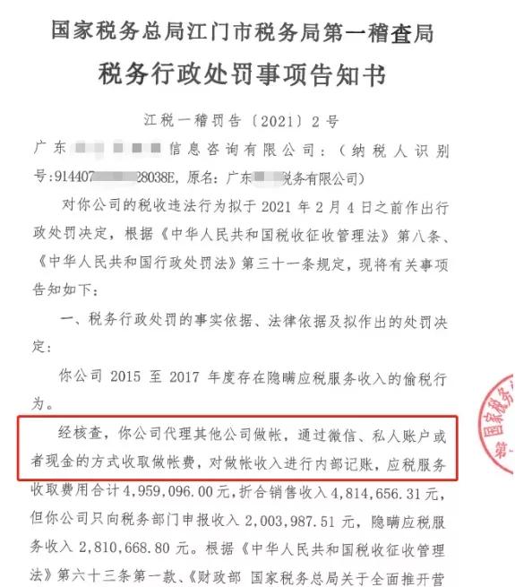 经核查,江门某公司通过微信、私人账户或现金收取会计费用,隐性收入281万元。最后缴税85万,罚款42万。