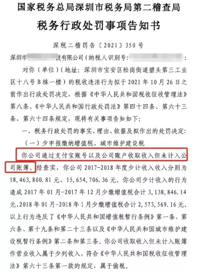 深圳某科技公司通过支付宝账户和公司账户收取收入,导致少缴收入3411.85万元、增值税和城市维护建设税571.24万元、企业所得税37.43万元。最终,公司被罚款50%,共计3243277.46元。