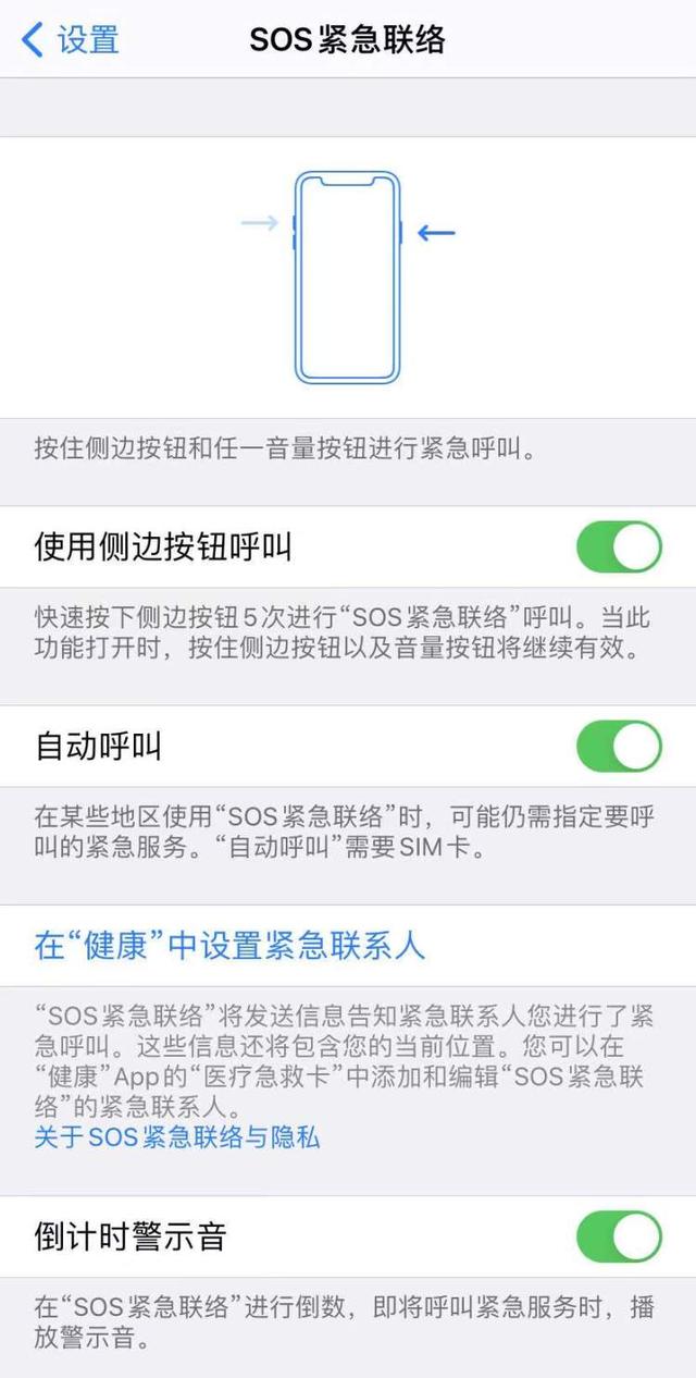 如果不方便触屏,继续按住这两个键,会有5秒倒计时自动呼救;有的机型连续按五次电源键,以“设置”的操作提示为准!