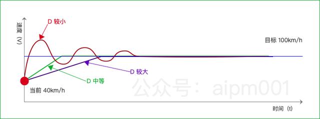 d值太大,减速度就大,也可以理解为目标速度100附近阻力大。那么就需要更长的时间才能达到目标。