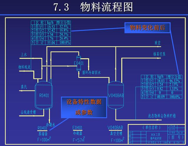 物料流程图是在方案流程图的基础上,用图形和表格相结合的方法,反映设计中物料平衡和热量平衡结果的图纸。