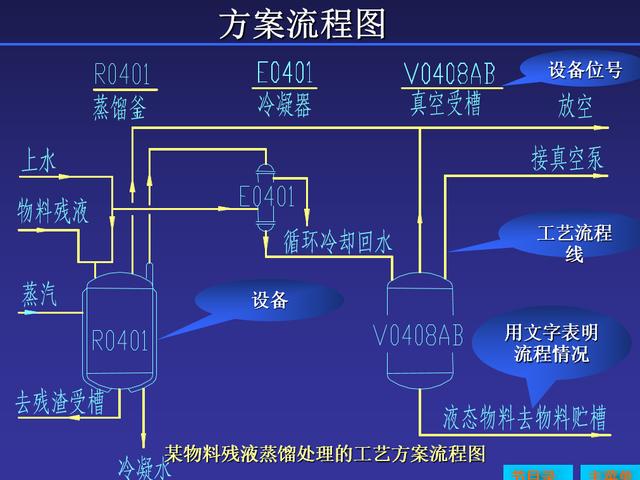内容:①设备——用示意图展示生产过程中使用的机器设备;用单词、字母和数字写出设备的名称和编号。②工艺流程——物料从原材料到成品或半成品的工艺流程用工艺流程线和文字表示。