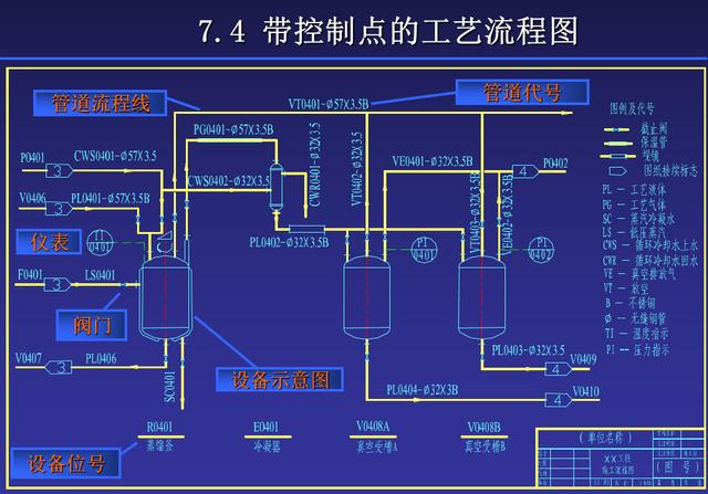 (1)该图以简单的形式展开同一平面上的所有工艺设备,然后配以连接的主、辅管道及管件、阀门、仪表控制点等符号。