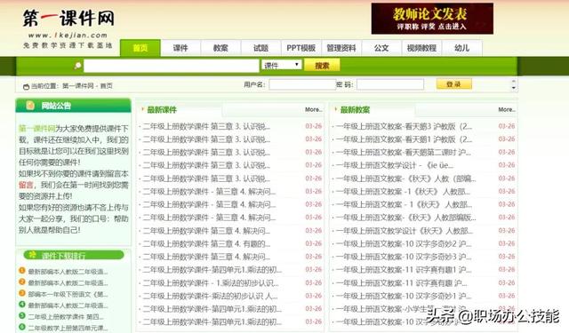 这是一个提供教学资源免费下载的网站,包括教学课件、教案、试题等。在不同的板块,不同的学科,不同的教材版本。在课件区,每个教学课件还附有详细的教案介绍和使用说明,有了教案备课进度会快很多。