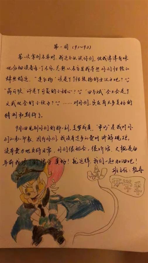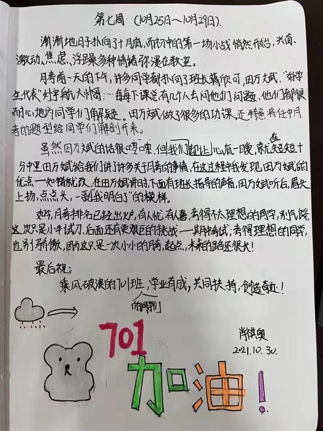 不仅对自己未来做出期望,桂老师还要求学生记录休班群体的成长故事。“渐渐地,日子快到10月底了,初中的第一场小战斗悄然开始,兴奋、激动、焦虑、浮躁等各种情绪弥漫在教室里。”从懵懂的初次见面,到激动人心的运动会,再到激动焦虑的月考...在高一(1)班的笔记本上,每周都会有一个同学记录下发生的大事件,用彩色的图片,写出独特的班级回忆。
