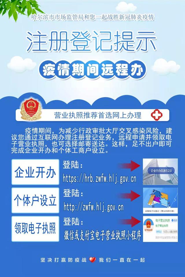 目前,哈尔滨的申请人可以选择互联网办理登记业务,可以远程申请和领取营业执照,也可以选择邮寄送达,足不出户即可完成企业开办和个体工商户设立。