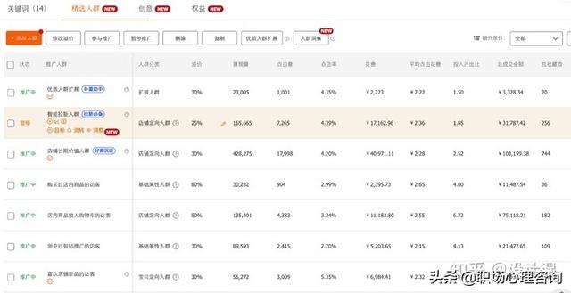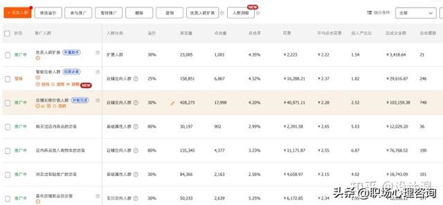 人群没有那么神秘。对于我的服装品类风格店,我只是开几个人群,都是店铺的人群包。不要聪明到以为自己比机器更懂自己的店,但是自己开一个定制人群会很可怜。因为店铺的人群标签早已形成,系统比你更了解你店铺的人群。关于所谓培训大师创造的一些概念,比如四层人群,五层人群,我一笑而过。
