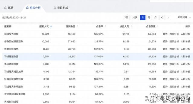 首先选择和产品最相关的,拿羽绒服男。如果这个词的数据不好,那就更不可能说什么棉衣大衣了,就是钱的问题,马上换钱。如果羽绒服男这个词很好,那么接下来我们可以操作面包衣,然后是棉衣男,最后是大衣男。这样一个选词的过程。