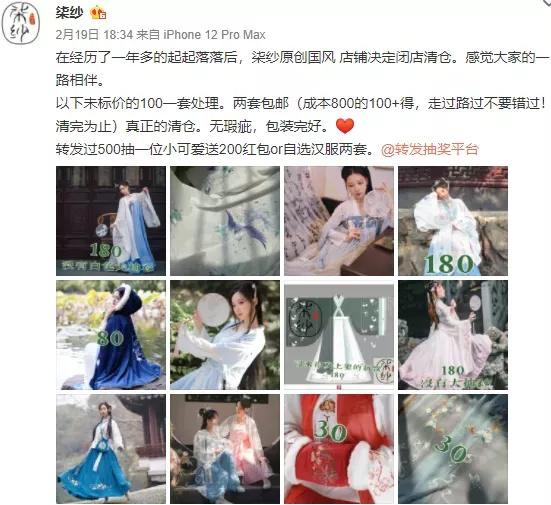 2021年,汉服宣传的热度持续,吸引了更多商家进入这一领域。但同一时期,由于疫情等多种因素,汉服市场不仅没有扩大,反而趋于萎缩。为了争夺有限的汉服消费市场,汉服商家之间的竞争更加激烈,不绝于耳。在这种形势下,也因为其他原因,一些汉服商家为了自保或者发展,开始选择关店清仓。