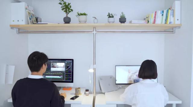 只要把靠墙角落的双人工作台放下,夫妻俩就可以一起工作了。