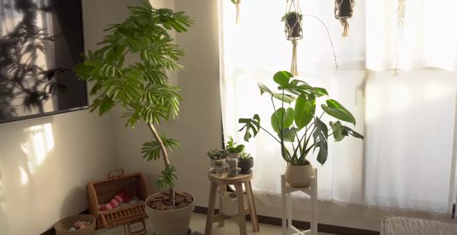 电视机的墙上有一大片空白。电视在架子上不占空空间,两边有很多花草,增添了生机和绿意。