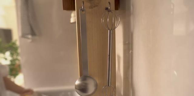右侧和搁板下方安装简易挂钩,挂小灶具和洗碗用海绵刷,方便取用。