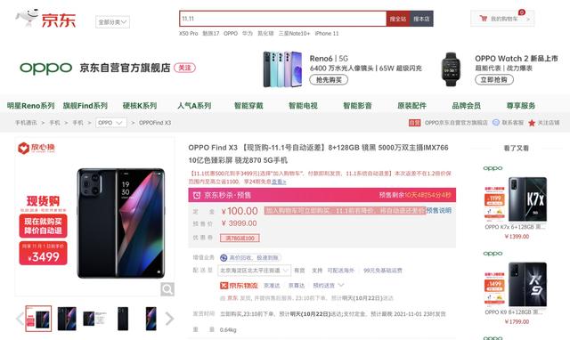 OPPO Find X3彩色影像旗舰手机,10亿彩屏,超越普通2K屏的屏幕质量。双旗舰影像体验,美景尽收眼底。JD.COM 8+128版本售价3999元。现在,如果你加入购物车,你可以立即购买。可以用3499的价格分享11.1的价格。11月1日降价会自动退还差价。OPPO K9主打娱乐功能和高性价比。骁龙768G芯片让您在使用移动娱乐时享受流畅的体验。JD.COM 11.11现货购买,11月1日前降价自动返还差价。别急,早买早享受,还能享受优惠,两全其美。