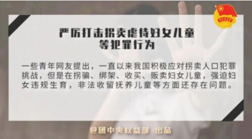 一些青年网民提出,中国一直在积极应对拐卖人口犯罪的挑战,但仍存在拐卖、绑架、买卖妇女儿童、强迫妇女非法生育子女、非法收留抚养儿童等问题。