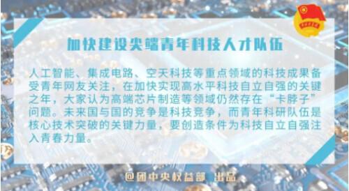 人工智能、集成电路、空天科技等重点领域的科技成果吸引了年轻网民的关注。在高层次科技加速自立自强的关键之年,大家都认为高端芯片制造等领域还存在“瓶颈”问题。未来国家之间的竞争是科技的竞争,年轻的科研团队是核心技术突破的关键力量。我们要创造条件,为科技自立注入青春的力量。