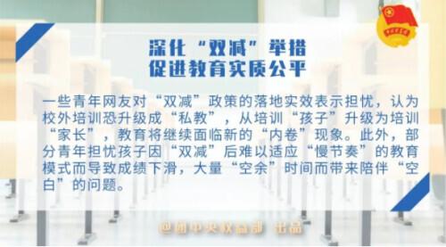 一些年轻网民对“双减”政策的实际效果表示担忧,认为校外培训可能升级为“民办教育”,从培训“孩子”升级为培训“家长”,教育将继续面临“内卷化”的新现象。此外,一些年轻人担心孩子因难以适应“双减”后慢节奏的教育模式而成绩下降,大量“空课余时间导致“空白”的问题。